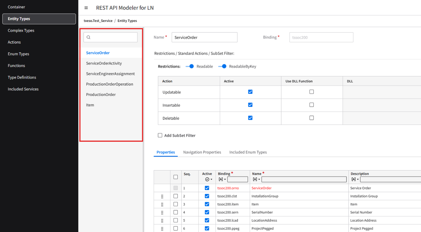 Each section, except for Container, includes a split menu listing the elements for that section. When you navigate to a section from the side menu, such as Entity Types or Complex Types, the first element is automatically selected, and its content is displayed on the right side of the split menu.