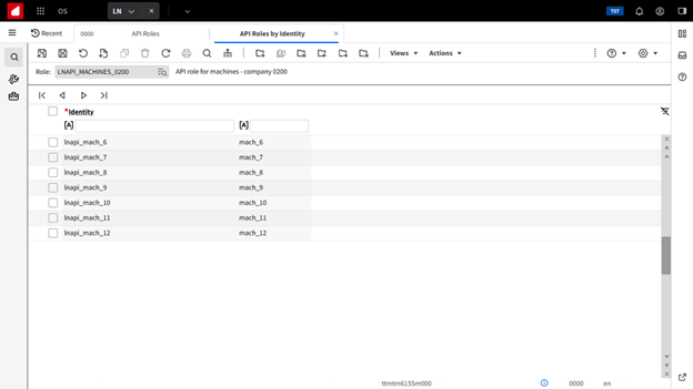 Machines 6 through 12 perform operations in company 200. Therefore, the API identities of these machines must be linked to the LNAPI_MACHINES_0200 role.
