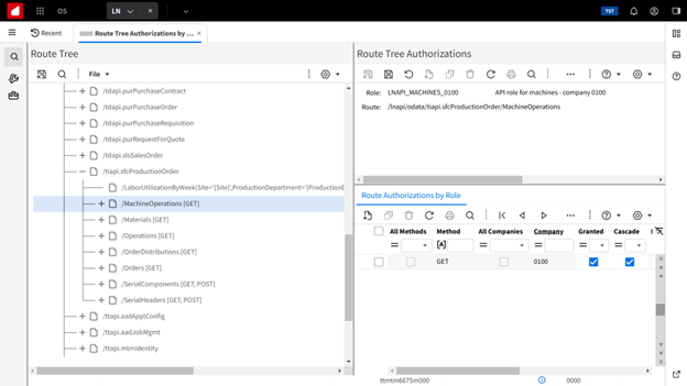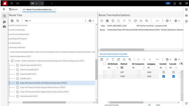 - In the tree, select /lnapi/odata/tiapi.sfcProductionOrder/MachineOperations. Then, on the Route Authorizations by Role tab, specify this information: