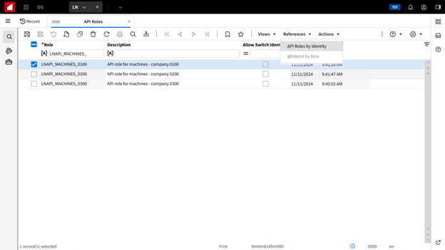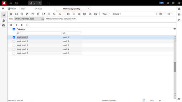 Machines 1 through 5 perform operations in company 100. Therefore, the API identities of these machines must be linked to the LNAPI_MACHINES_0100 role.