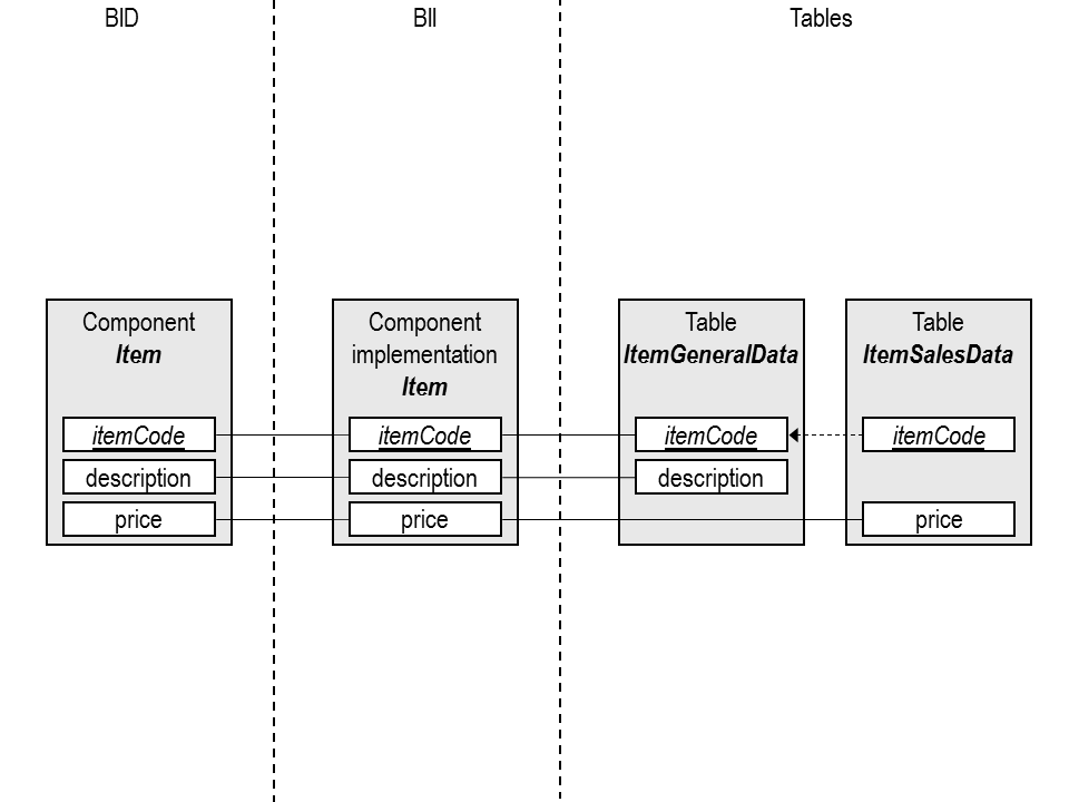 This is the situation that was supported already in Integration Studio 6.1. In this case, the non-root table is really aggregated in the root table. A row in the root table will always exist for a component instance. A row in the non-root table need not exist; it will exist if a price is set or if the table is marked as ‘mandatory’ in the BII. If a component instance is deleted, then the non-root row is deleted first and then the root row is deleted.