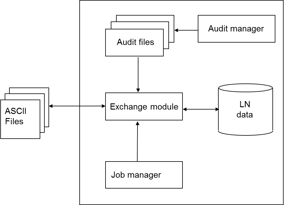 After the exchange information is set up, you can manually activate the actual import or export process or the job manager can update this information. You can also create an export file based on audit information. This diagram shows the relation between the Exchange module, the job manager, and the audit manager: