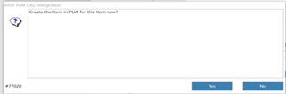 If you select Create Item check box, the item is created in PLM when user clicks , without waiting for the Save to PLM operation. Default setting of the Create Item is defined by the integration preference Create Item Checkbox Default under group in .