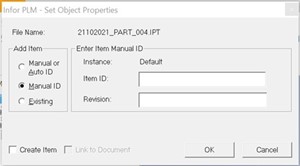 If you select the Manual or Auto ID check box and leave the Item ID: field blank, an item and an itemID is generated in PLM. If you enter an ID in the Item ID:, an item is generated with the ID that you entered in the Item ID: field. The Revision field is optional.