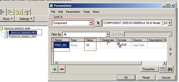 Select the component of the assembly to view/ change the balloon mapping parameter value. In Look In, select Component and select the component in the assembly model tree as shown below.