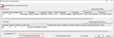 When you select the preference during Download in the General Option of PLM preferences, the integration does not perform the mapping for the files which are in Released status in the PLM during the download process. It is recommended to select the check box to improve the download performance of large assemblies in the View/Edit File operation. However, you should be aware that some file preferences may not be up to date with PLM.