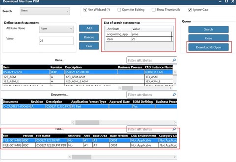 For example, below search statements look for items that originated in Creo and item id containing value "23". Files linked to these items are displayed in Files grid. Select a file and click on and file along with its dependents are downloaded into local system and the selected file is opened in Creo.