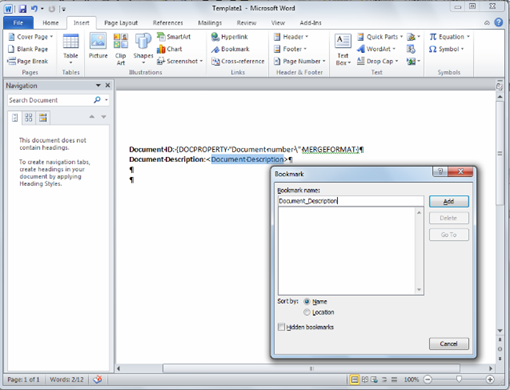 - the name for the bookmark in the Bookmark name field, for example, Document Description.