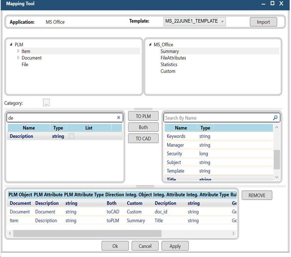 In the dialog box, you can define the mapping rules that are used to map attributes between PLM and Microsoft Office. This dialog box is divided into two sections, one for the PLM attributes and one for the Microsoft Office attributes.