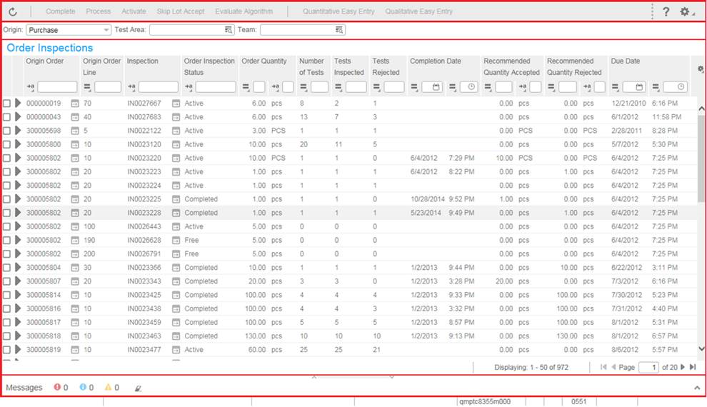 Con los criterios de selección definidos puede seleccionar los orígenes de orden que tienen una orden de inspección vinculada. En el nivel de inspección de orden puede revisar: