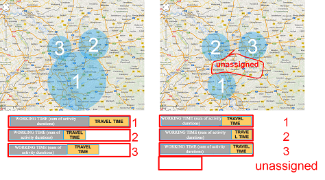 Dans l'image ci-dessus, la charge de travail par groupe est idéalement répartie entre les divers groupes. Cependant, le moteur tente toujours de mettre en balance la capacité disponible et le temps de déplacement minimal. Quand la capacité est infinie, le moteur de mise en groupe affecte une prestation au technicien qui est le plus proche géographiquement. Lorsque la capacité disponible est insuffisante, un certain nombre de prestations demeurent non affectées. Aucun des deux scénarios n'est la solution recommandée. L’utilisateur doit donc définir et influencer la répartition manuellement.