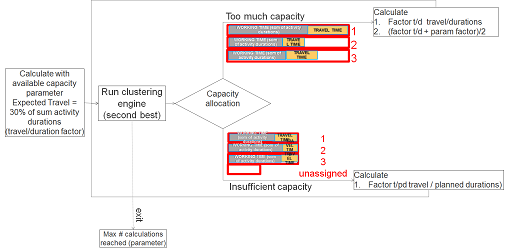 Pour permettre une bonne répartition, le moteur de planification prend en charge le facteur déplacement/durée. Le temps de déplacement est comparé au temps de travail (c'est-à dire à la somme des durées). Le moteur utilise un paramètre de groupe pour affecter une ressource en fonction du temps déplacement estimé. Or cette approche peut engendrer une situation de sous-capacité ou de surcapacité. Dans une situation de surcapacité, le moteur de planification réduit l'incidence du facteur déplacement au moyen de la formule (déplacement en entrée - ratio durée) + (déplacement résultant - ration durée)/2. Dans une situation de sous-capacité, le ratio déplacement-durée résultant est utilisé comme option suivante. Pour limiter l'impact sur les performances, vous pouvez définir le Nombre d'itérations dans la session Paramètres planification des ressources (tsspc0101m000)