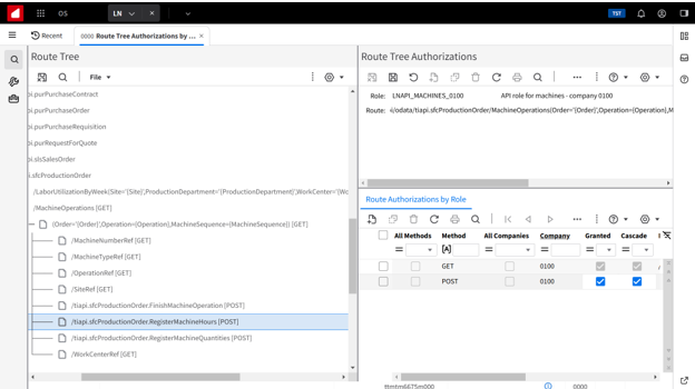 - In the tree, select /lnapi/odata/tiapi.sfcProductionOrder/MachineOperations. Then, on the Route Authorizations by Role tab, specify this information: