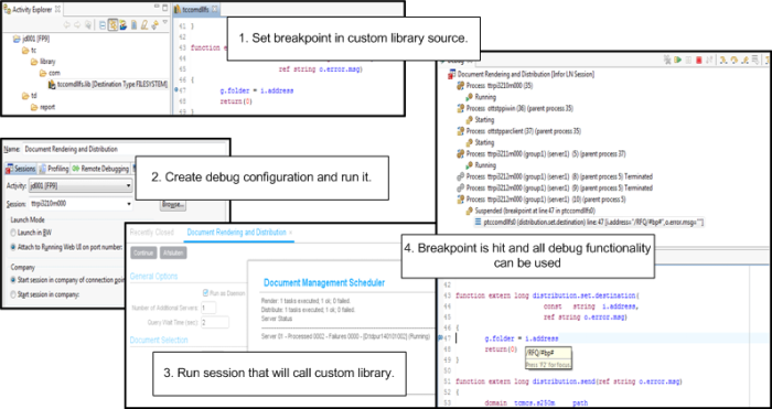 You can debug custom implementations, such as custom destination types, custom e-mail implementations, and custom fax implementations, using Infor LN Studio. These custom implementations are libraries that are called by these sessions:
