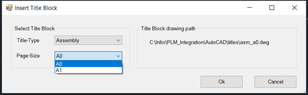 Click on integration menu "Insert Title-Block", The Insert Title Block dialog box opens. If you are using the integration for the first time, the Title Type and Page Size will have no values (as shown below).