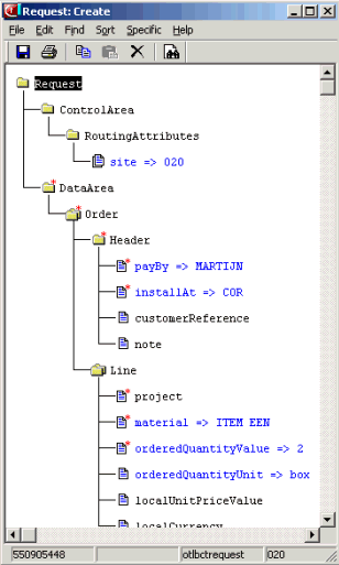The following figure shows the XML schema file of the Request argument of the Create method of the Order (tlbct790) Business Object.