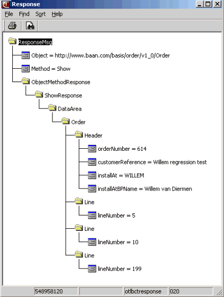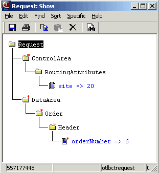 The following figure shows the XML schema file of the Request argument of the Show method of the Order (tlbct790) Business Object.