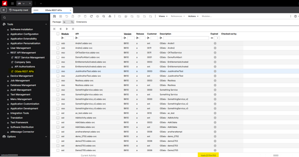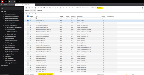 - Select the service and click Modeler in the OData REST APIs (ttadv2570m700) session to open the REST API Modeler for LN.