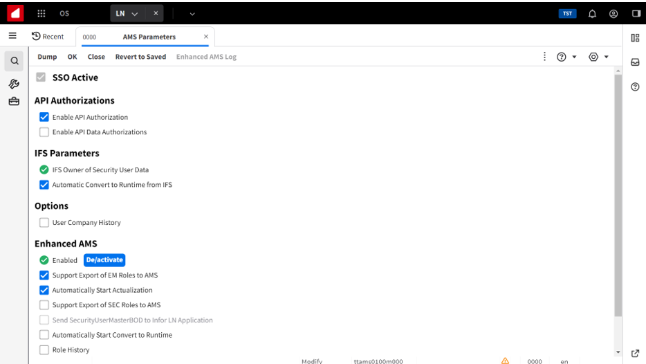 Enabling the API authorizations Start the AMS Parameters (ttams0100m000) session. Make sure the Enable API Authorizations check box is selected. Click OK.