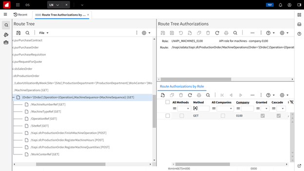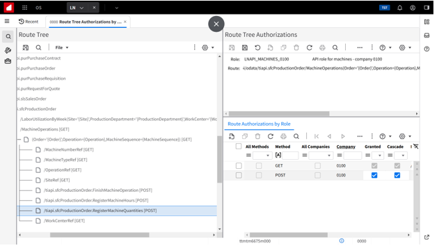 - In the tree, select /lnapi/odata/tiapi.sfcProductionOrder/MachineOperations. Then, on the Route Authorizations by Role tab, specify this information: