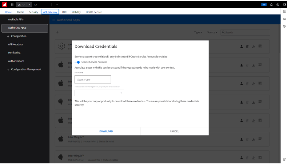 You must program each machine to use the credentials of the service account user svc_ln to send API messages to LN. You can download these credentials from API Gateway.