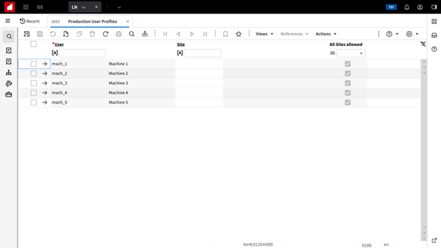 Machines 1- 5 perform operations in company 0100. Therefore, you must create production user profiles for these machines in company 0100.