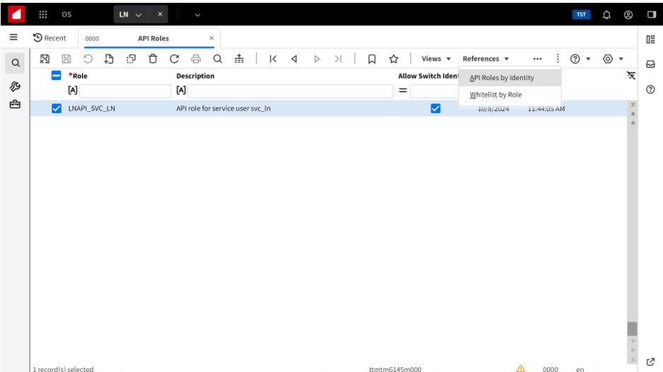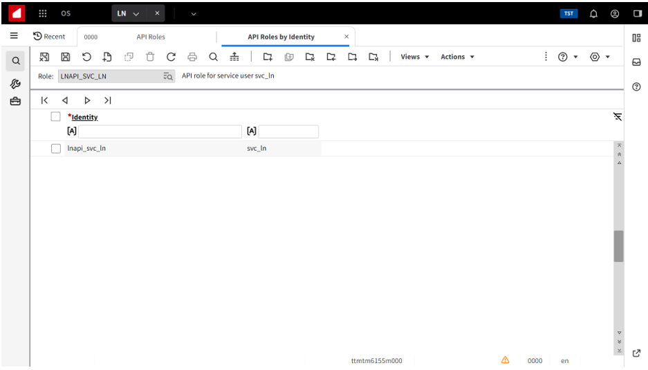 Assigning the service user role to the API identity of the service user Start the API Roles (ttmtm6145m000) session. Select API role LNAPI_SVC_LN. Select References > API Roles by Identity . The API Roles by Identity (ttmtm6155m000) session starts. Add the API identity, lnapi_svc_ln, of the service user.