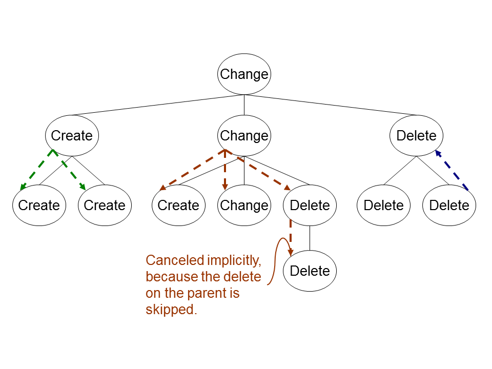 In case of a Change method, the situation is not that straightforward, because a change combines the top-down and the bottom-up approach. A change may include create or delete actions on subcomponents. A cancel on a delete for a child, does not impact the change on the header! Three cancel situations are shown in the following example.