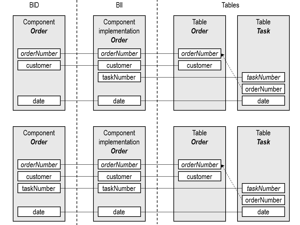 As shown in the picture, this situation has two variants: the non-root table identifier is either hidden or used as an attribute in the BID. In the first case, the value must be generated. In either case, the implementation (including hooks) must make sure that a one-to-one aggregation relationship is maintained: each order must be in only one task.