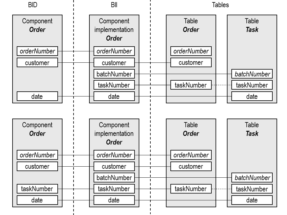 The root and non-root table are joined using the taskNumber. In this case the relation can have any direction: refer from root to non-root table or from non-root to root table. For that reason no arrow is shown. Note however that the direction must be defined in the BII!