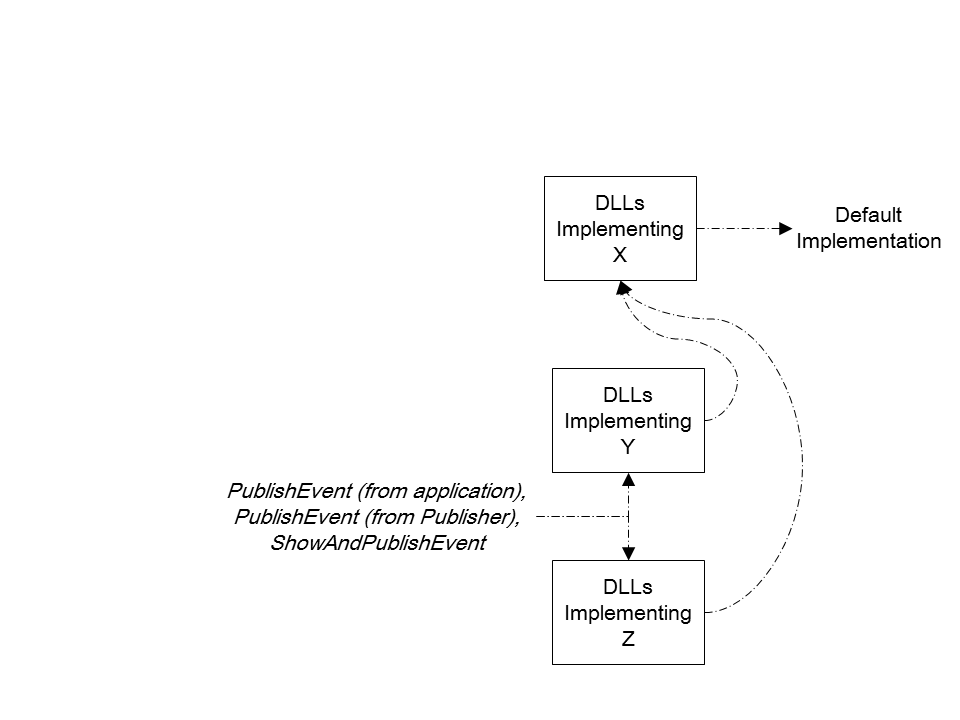 - Application events are handled in X. This means X also contains the subscription for application events. The application can use the PublishEvent or ShowAndPublishEvent from Y or Z, but in that case Y and Z will do nothing else than forward it to X. The application can also use the PublishEvent from X directly. However, the ShowAndPublishEvent for X usually will not work, because the business interface implementation for X does not have a mapping to tables.