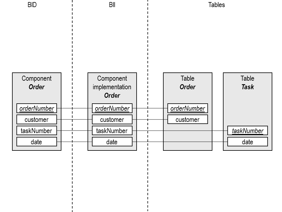This situation is unsupported, because although no reference needs to be defined in the data model, a join relationship must always be defined in the BII. If multiple tables are linked to a component without such a relationship being defined, then the implementation will not work for either List/Show or Change/Delete methods. For example, a List/Show query will result in the so-called Cartesian product, containing duplicate order numbers, because every task row is joined to every order row. And when changing the date attribute, we won’t be able to find the row in the Task table if no join is specified.