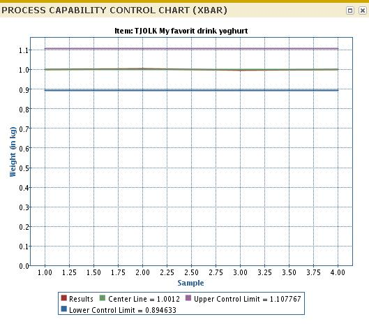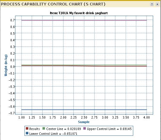 The lower plotting area of the chart is the standard deviation (S) of the measured values for each sample. The S chart is created first to ensure the statistical control of the sample variability.