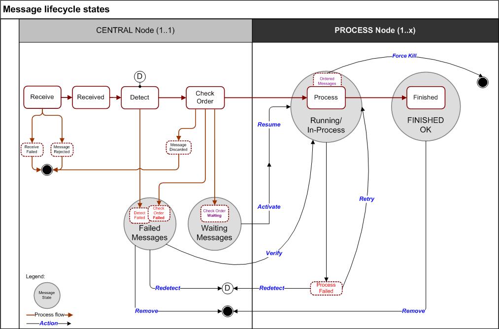 On an overview, this diagram shows the message runtime states and the available actions. You define the partner agreement process steps in Partner Agreement tool and you monitor the message states in EC Management page in Grid.