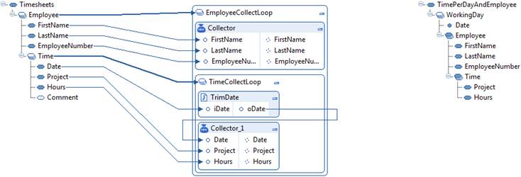 The prerequisites are exactly the same as before, we want to group the time transactions per day (date) and employee. The problem is that the input element Date now contains a time stamp, for example 2013-06-17T16:43:23. The time transactions may be created at different times per day. This setting makes it impossible to group the time transactions per date using the input data as it is. We need to remove the time part of the time stamps before restructuring the data. To achieve this, we need to use Collector functions.