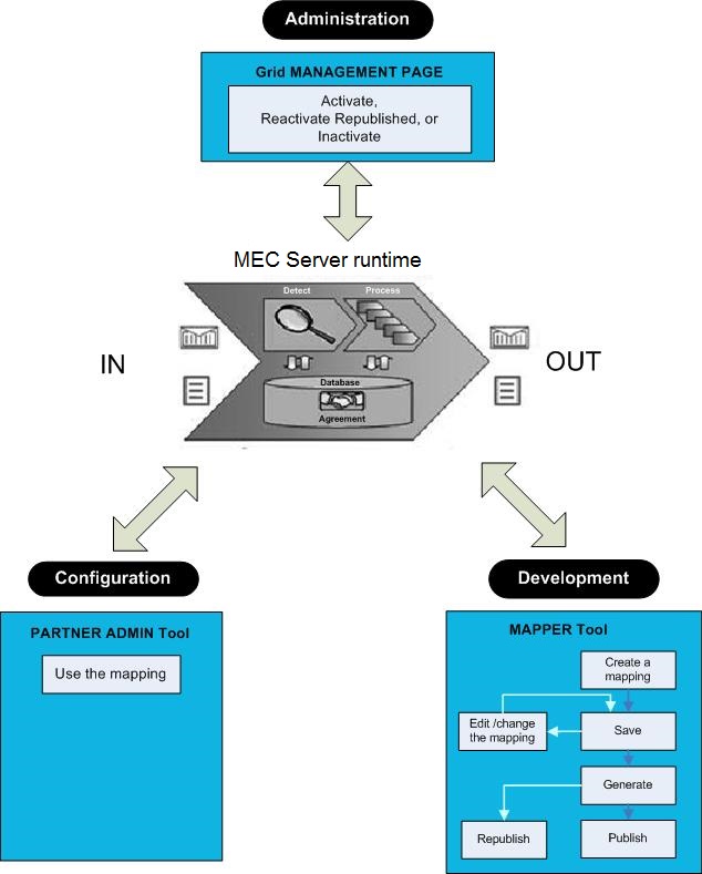On an overview, this diagram shows that you use Business Document Mapper to create a mapping, activate it in grid Management Page, then use it in Partner Admin tool. You must activate the mapping first, then reload the cache to activate the Partner Agreement using the mapping.