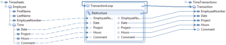 The Restructure function does all these without the need for the user to create a single line of Java code. At runtime, all the processing is completed in a similar but more complex way. It is similar to solving the problem with a manually created Java code in the mapping.