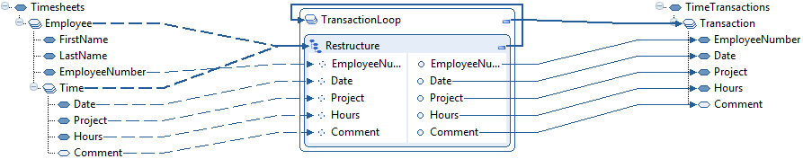 - We need to loop through all time transactions to create the repetitive Transaction element in the output document. Start by creating a loop that controls the output element Transaction.