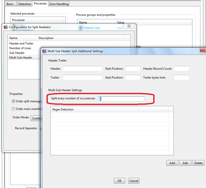In Split Redetect process for large files, messages can be split based on every N:th occurrence regardless of which expression will match the splitter.