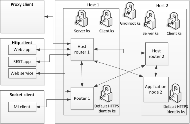 Finally, there are keystores for the host default HTTPS identities for each host. These contain the credentials used for SSL server authentication, when clients connect to the grid. By adding additional HTTPS identities, routers can be configured to use other keystores.