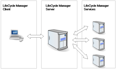 The LifeCycle Manager Client connects to the LifeCycle Manager Server, which, in turn, connects to each LifeCycle Manager Service as shown in this diagram: