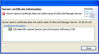 Server name in certificate does not match name of LifeCycle Manager Server!