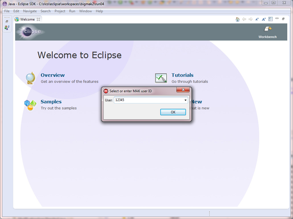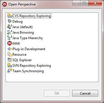 Opening the MAK perspective Use this procedure to open the M3 Adaptation Kit (MAK) perspective. Start Eclipse. A user authentication message is displayed. Select a user ID in the list or specify a new user ID. Click OK. The Eclipse Welcome tab is now enabled. Click the Workbench icon. The Eclipse workbench is displayed. Select Window > Open Perspective > Other. The Open Perspective window is displayed. Select MAK in the available perspectives. Click OK. The MAK perspective is displayed with its default views.