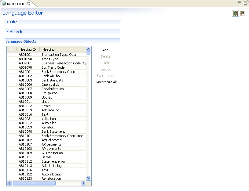 You can edit a language file or component using the Language Editor. The Language Editor is used to manage language files. It is displayed when you use the Get or New command for language files, or when you open a language file from the M3 Adaptation Kit (MAK) Navigator view.