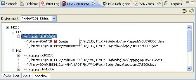 The MAK Administration tab displays allows you to view all the files in the sandbox for the current MAK user. The sandbox file structure is removed when all files in the sandbox is removed. You can delete files in the sandbox only from the entity level and above.