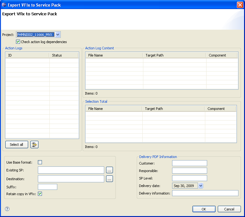 The first time an Export VFix to Service Pack is performed for a particular project, the target location is empty. For subsequent exports for the same project, however, the previously selected target location is set as default path.