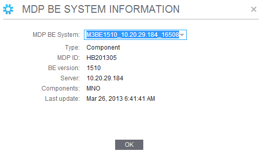 Note: You can select from the list and view another MDP BE Installation.Type Method used to generate the BE system metadata, by system configuration or by component. MDP ID ID assigned to the MDP client version. BE version System metadata BE version. Server Server where the component is installed. Components List of system configuration components. For example: MVX, MAR, MDK.