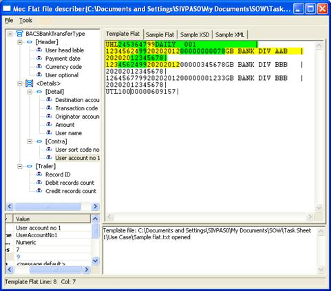 In this example, only four records are highlighted in the flat template file. The fourth record seems incomplete, even if the definition in the Message Definition view seems correct. This is a mismatch caused by the contents in the Template Flat view being sample files instead of template flat files and there is a repetition of the Detail and Contra records. Template Flat view does not consider repeated records.