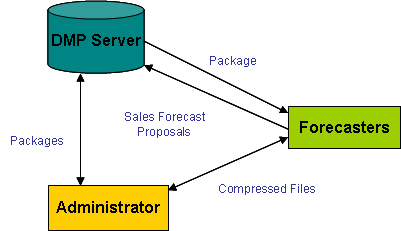 The administrator generates a forecast package for each forecaster including the M3 DMP datasets needed and other information like user rights, user domains, and so on. These are placed on the package area of the M3 DMP server. Forecasters with connection to the M3 DMP Server can download their packages directly from the server. For forecasters with no connection to the M3 DMP Server, the administrator can distribute the forecast package as a compressed file. Based on a forecast package, a forecaster makes a Market Forecast Proposal. This is returned to the administrator as the forecast package including the proposal. This is done the same way it was received, by direct upload to the M3 DMP Server or as a compressed file.