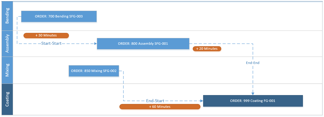 - Start-Start: This job can start only after at least N minutes after the predecessor has started